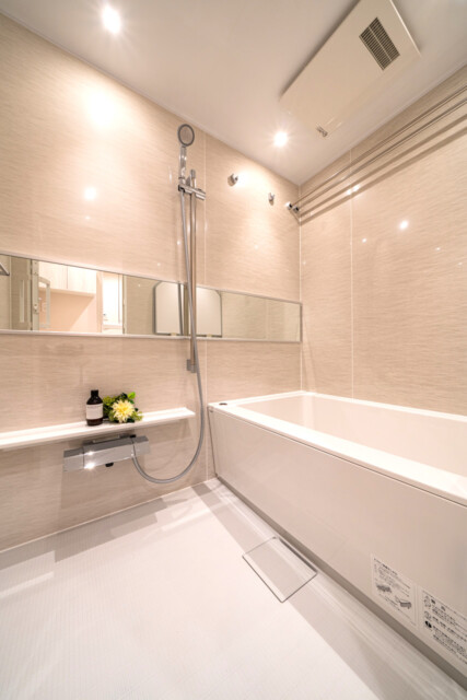 ベージュの木目パネルを使用した浴室は柔らかい雰囲気でとても癒されます。追い焚き機能付きユニットバスはワンタッチでお風呂を沸かし保温もしてくれる優れもの。ご家族で入浴時間がバラバラになっても、いつでも温かいお風呂に入れますよ。浴室乾燥機能も付いているので、天気を気にせずご自身のタイミングで洗濯可能♪