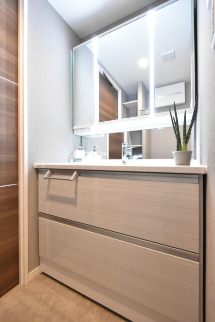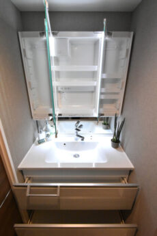 洗面台は身だしなみを整えるのに便利な三面鏡付き。鏡の間の照明のおかげで鏡を見る時に影になることもありません。LEDのおかげでいりいろなことが出来るようになりましたね。