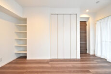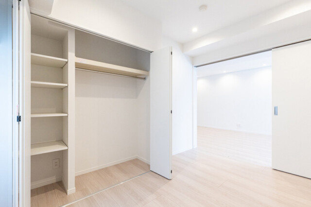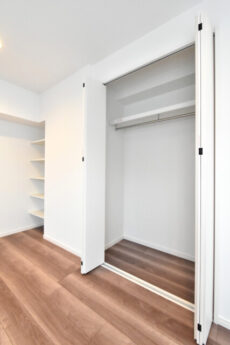 収納はオープンの収納棚とクローゼット。収納棚に扉が無いのは、ベッドを置くことを考えてなのかもしれませんね。クローゼットは間口の広いタイプで使い勝手が良さそうです。