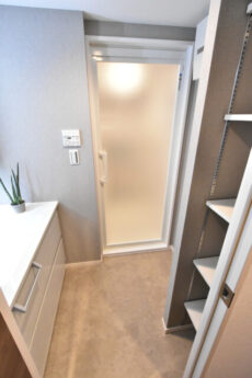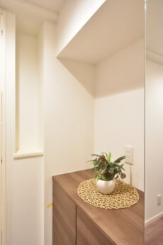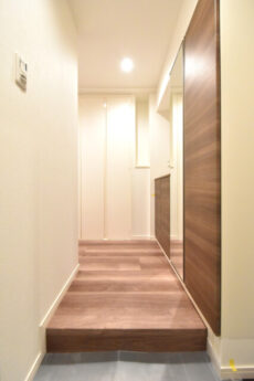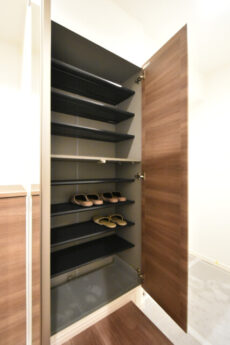 玄関から廊下にかけては天井まで高さのあるシューズボックスや収納棚がずらりと並んでいます。豊かな収納は綺麗なお部屋作りの強い味方ですよね。