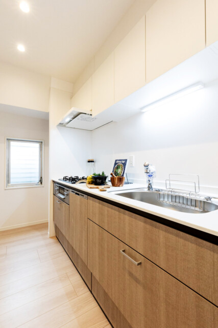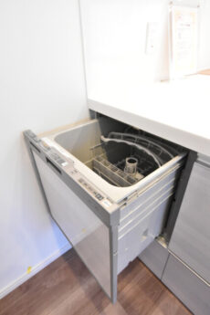 キッチンはLDとひと続きながら少し奥まった所にあり、イメージとしては独立タイプに近いと思います。最近はカウンターキッチン押され気味ですが、生活感の出やすいキッチンをリビングから目立たなく出来たり、臭いや汚れがお部屋まで広がりづらかったり、人目を気にせずお料理に集中出来たりと、独立タイプにもいいところが沢山あるんですよ。奥には食品ストックなどに使える収納棚付き。食器洗浄乾燥機や浄水機能一体型水栓など便利な機能も充実しています。
