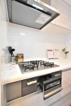 コンロは3口、グリル付。温度設定やタイマーが使える高機能タイプです。調理中は換気扇をお忘れなく。少し早めに回し始めると効果的らしいですよ!