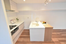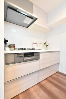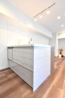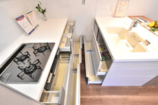 作業スペースが広くとれたり、移動が少なくて済んだりといろいろメリットのあるキッチンです。ただし、家電などを置く場所がキッチン内に確保しづらいので考慮が必要です。