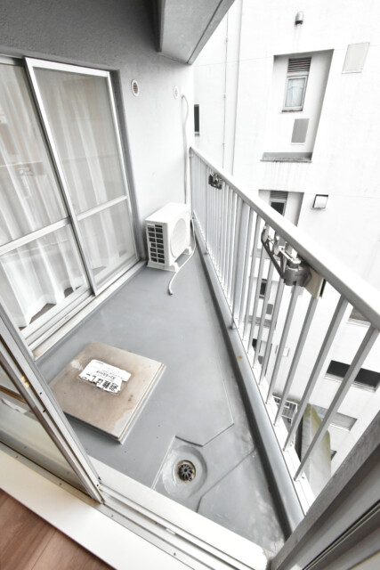 広さは4.02㎡、南西向き。三角形のバルコニーです。手すりには物干し金具が設置され、洗濯物も干せますよ。その際は、足元の避難ばしごに躓かないようお気を付けください。