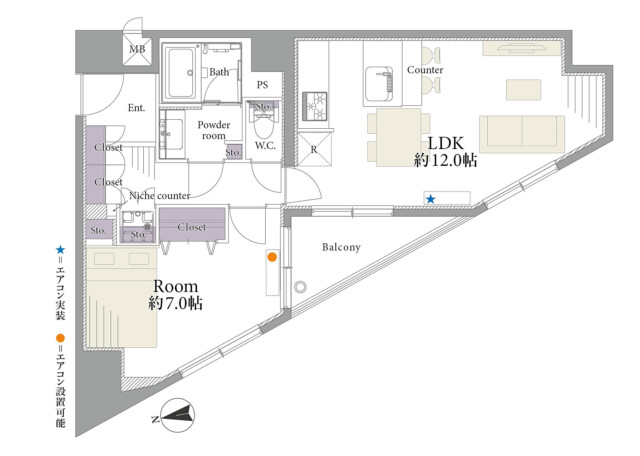 角がひとつ切り取られたような形の台形のお部屋です。オーソドックスな縦並びのレイアウトをしようとすると、リビング部分が狭くなっているので厳しそうですね。間取り図の例のようにシンク横にダイニングを設けるか、いっそのことキッチンカウンターをダイニングテーブルとして使うのもアリかもしれませんね。