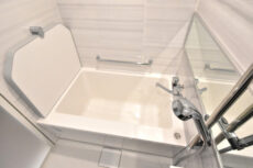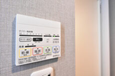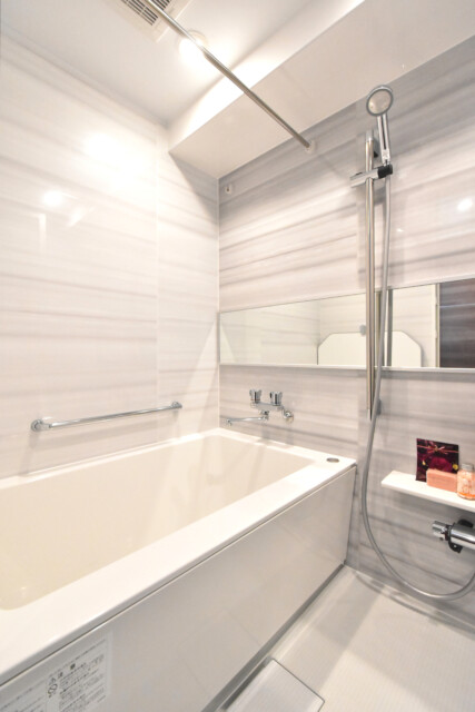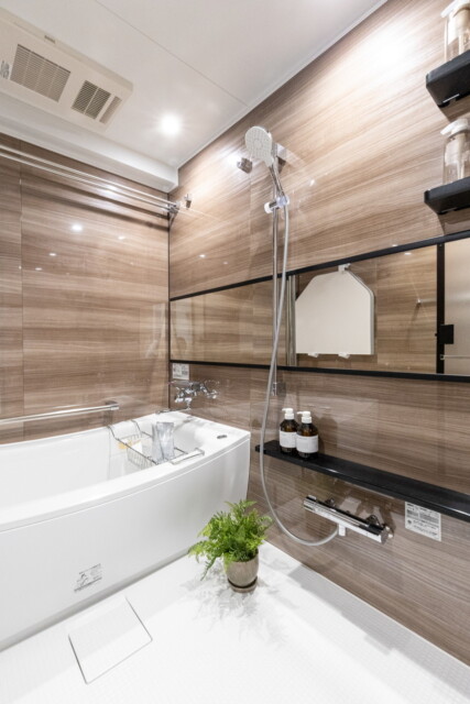 浴室はダークブラウンの鏡面仕上げパネルを使用。落ち着いた雰囲気でリラックスしたバスタイムを過ごせそうですね。浴室換気乾燥機が付いているのでお天気を気にすることなくお洗濯が出来ますよ。
