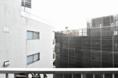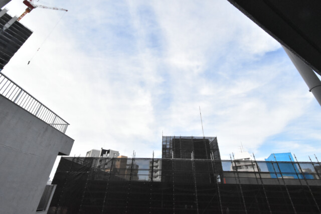バルコニーの正面はこんな感じ。いい眺めとは言えませんが、大規模改修中の黒いネットが外れればもう少し明るくなると思います。