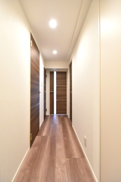 さらに左に曲がって伸びた廊下は、木目を生かしたフローリングとダークブラウンの建具で落ち着いた雰囲気。正面ドアのスリットからはお部屋の光が漏れています。