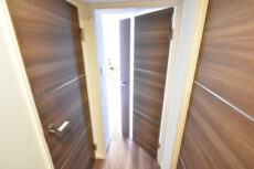 少し小さめな分入口に引き戸を使ってデッドスペースが出来ないようにしたり、お部屋のスペースを有効に使えるような工夫がされています。クローゼットはハンガーパイプと棚が設置されたタイプ。