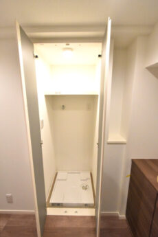 【洗濯機スペース:廊下途中にアリ・照明・収納棚付き】