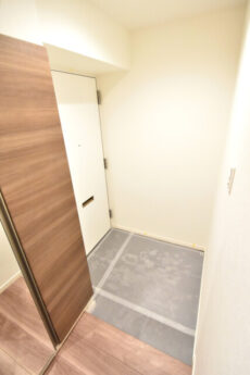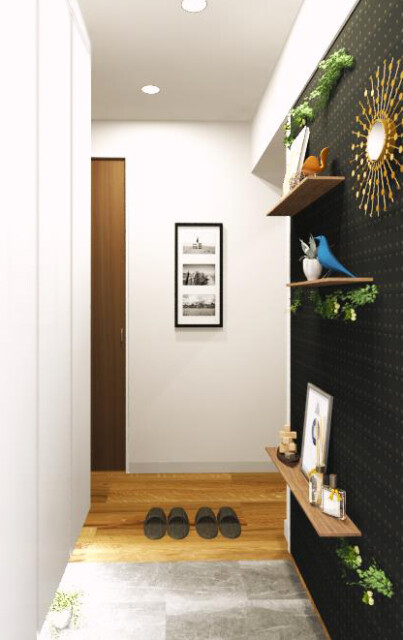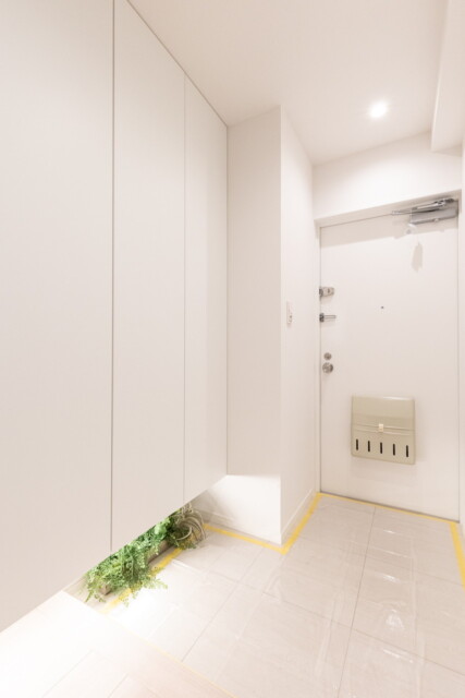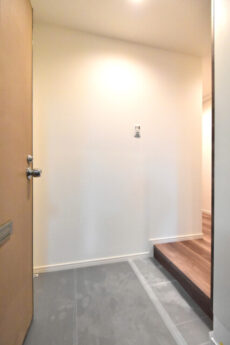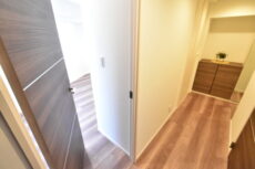 玄関の正面に居室への扉がなく戸口から室内が見えないレイアウトになっています。宅配便やフードデリバリーなど知らない人が訪ねて来る機会の多い今の時代、プライバシーに配慮された嬉しい造りと言えますね。間取り図を見ると、左側に洋室、右に進むとLDKや水回りがあるようです。シューズボックスは収納力抜群のトールタイプ!