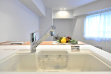 白いキッチンとシンプルながらもセンスのいい空間です。