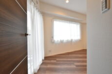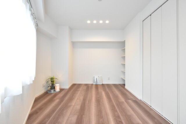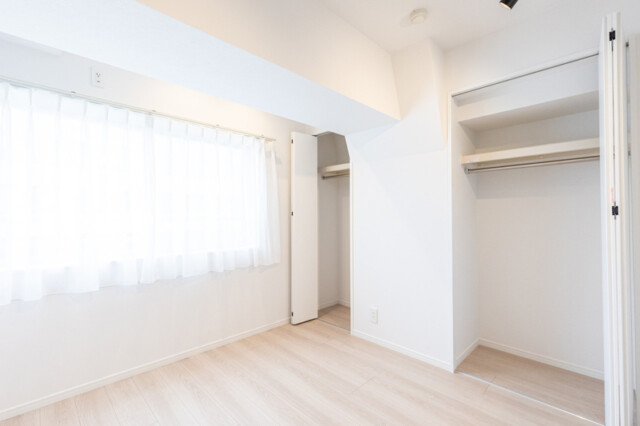 東向きの窓の付いたお部屋です。二つの洋室の中では大きい方なのでメインのベッドルームにオススメ。中央の梁が気になるかもしれませんが、寝室として使うことを考えればあまり問題はないと思いますよ。大小二つのクローゼット付き。