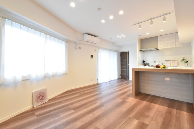 ワイドスパンのお部屋には南西・西向きの窓が並んでいます。長辺から光が入るとやはり明るいですね。エアコンも初期装備されていて、お引越し直後から快適に過ごせますよ。