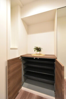 シューズボックスはロータイプとトールタイプがひとつづつ。可動式の棚を調節すればブーツなども収納可能です。扉に姿見が付いているのも嬉しいですね。