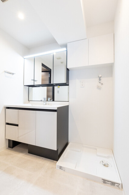 洗面室入って左手に洗面台、正面にバスルーム、右手に洗濯機置場の並びです。