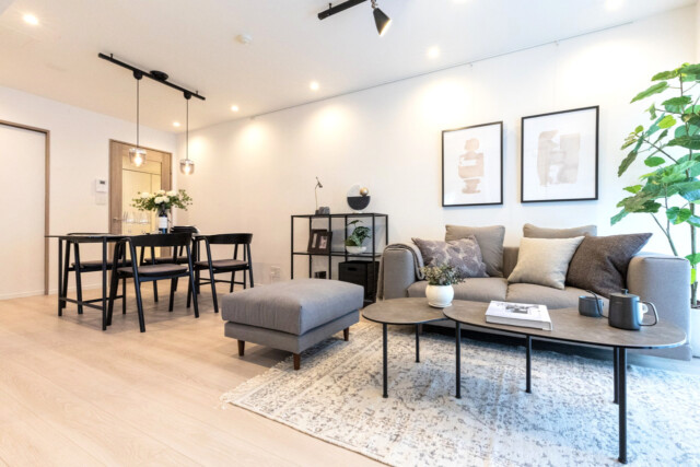 これらの家具は付いてはきませんが、ディスプレイされていると実際の生活イメージがしやすくて助かります。お部屋自体はシンプルな内装なので、ディスプレイのようにグレーや黒を多用した家具を置けばモダンな雰囲気になりますし、木目の家具を増やせばもっとナチュラルな雰囲気にもなりますよ。サイズなども合わせて参考にさせてもらいましょう!