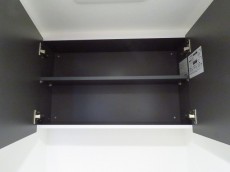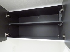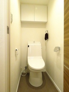 トイレはウォシュレット付き。ペーパーのストックの保管に便利な吊戸棚も設置されています。
