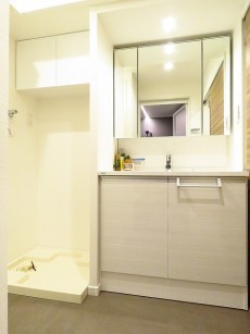 洗濯機置場と洗面化粧台はお隣同士。鏡の裏、洗面ボウル下、洗濯機置場上と収納も多彩です。