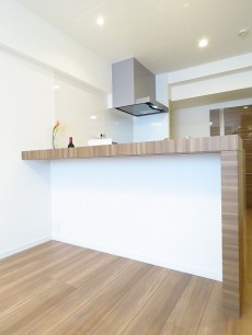 そしてキッチンの反対側はイスを2つ並べてダイニングテーブルとしてもご利用いただけるカウンターが設置されています。