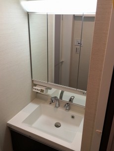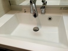 右手の洗面台は、お部屋のフローリングと同じトーンの木調に真っ白な洗面ボウルの洗面台です。
