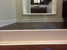 廊下に戻ってお隣は洗面室&バスルームです。廊下から洗面室、洗面室からバスルームと段差がありますのでお気を付けください。洗面室は少し狭めです。