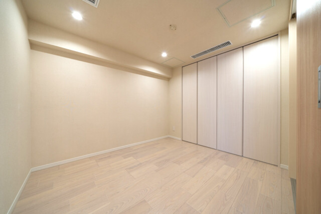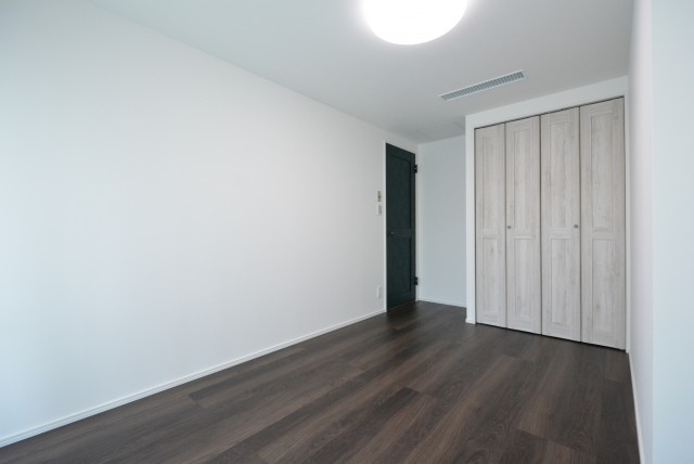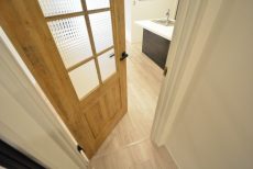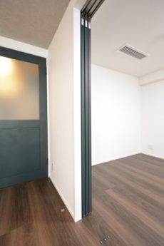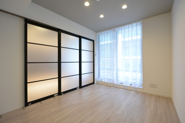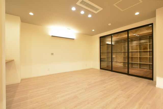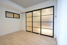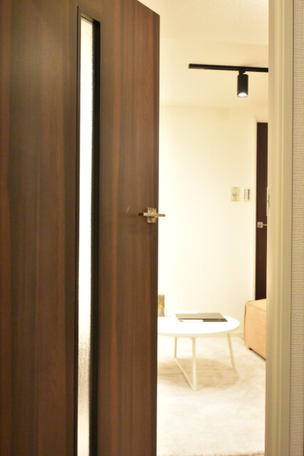 濃いめフローリングに白のクロスのオーソドックスなお部屋に、個性的な建具がアクセントになっていますね。高級感いっぱいです(^^♪