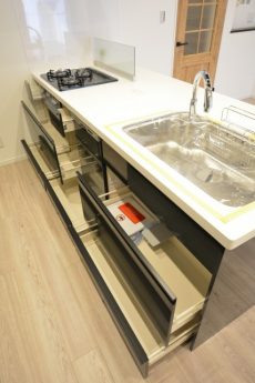 収納は調理台下と吊戸棚。引き出しタイプは奥の物まで取り出し易くて助かります。フライパンなどは立ててしまうといいらしいですよ。