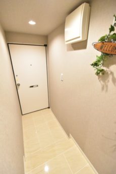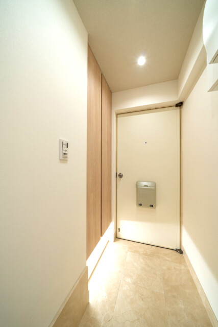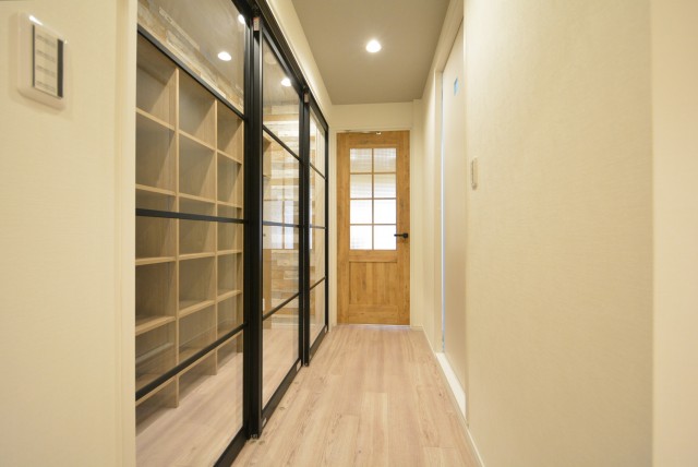 そして玄関を上がった廊下にもシューズボックスがあります。靴以外のいろいろなものを収納できそうです。奥に見える扉がリビングにつながっています。