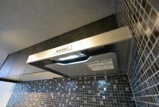 スッキリとしたデザインの換気扇もいいですね。キッチンの壁もちょっとした棚になっています。調味料を置いたりストック品を置いたりできます。
