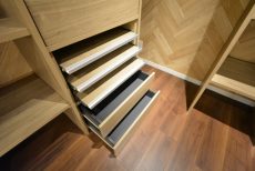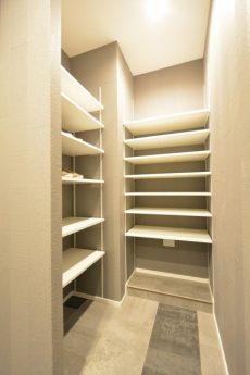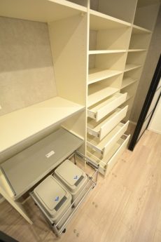 真ん中左は家電ラックとゴミ箱置場。ゴミ箱置場が確保されているキッチンって驚くほど少ないんですよ。見逃しがちなポイントです。残り二か所は収納棚。引き出しが付いている段もありますね。