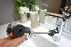 水栓はハンドシャワータイプです。洗面台下の空間に椅子を置いて、ドレッサーの様に使う事も出来そうですね。