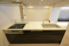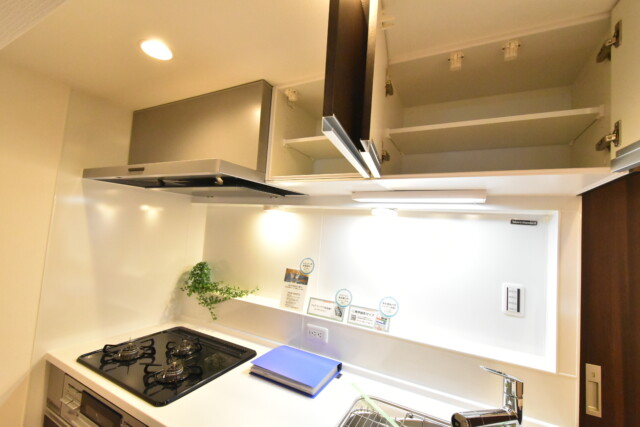 ビルトインの三口ガスコンロ。シンク下の収納だけでなく、上部には吊戸棚。