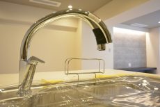 水栓は浄水機能付きシャワー水栓。切替えひとつでいつでも美味しいお水が出てきます。気軽にお茶やコーヒー、お料理などにも使えますね。