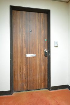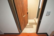 絨毯張りの内廊下を進んで玄関に到着!玄関ドアでは珍しい内開きです。