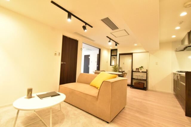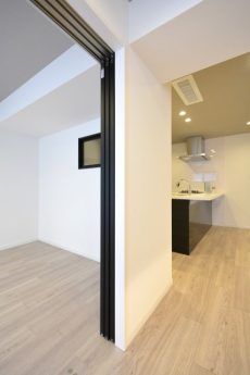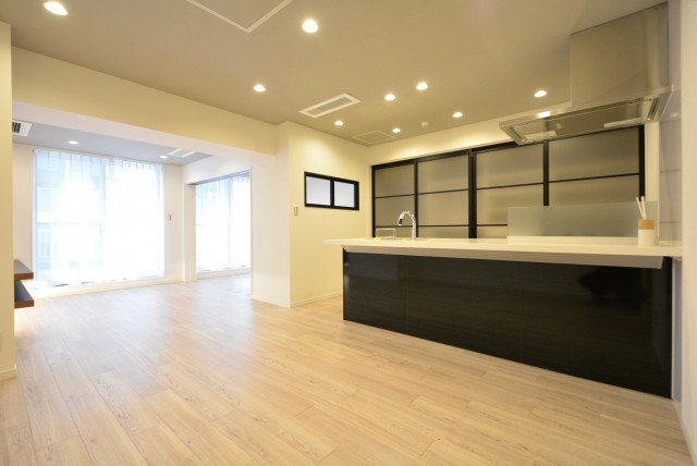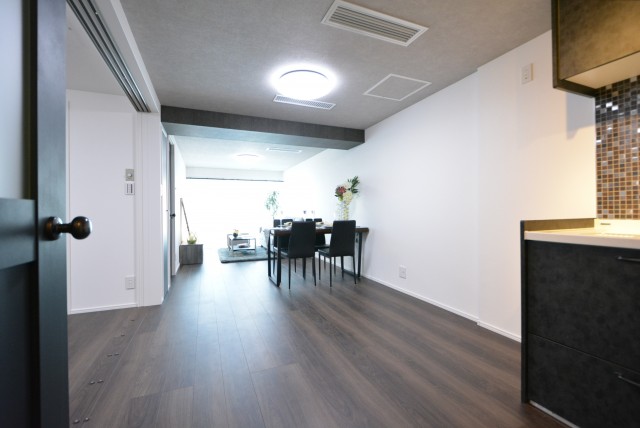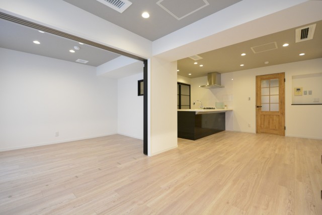 こちらは約16.4帖のリビング・ダイニング・キッチン+約5.2帖の洋室。白と黒、メリハリのきいたシャープな印象のお部屋です。