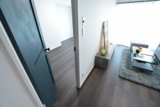 早速開けてみましょう。白い壁です。家の中がいきなり丸見えになるタイプのお部屋ではないですね。リビングは右手側に広がっています。左壁はアクセントウォールになっています。洒落てますね。