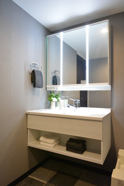 三面鏡付きの洗面台。鏡の間にLEDが付いていて鏡を開いた時も影になりません。