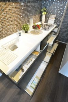 調理台下は食洗器と引き出しタイプの収納に。食洗器憧れます(*‘ω‘ *)もう、食器洗い当番を決めるじゃんけんもしなくていいんですね(笑)