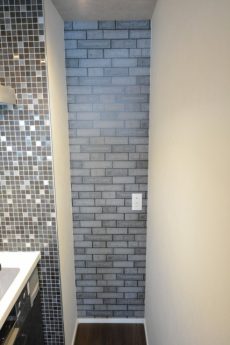 こちらはトイレ。黒ですが真っ黒という訳ではなく、映り込みや光の加減でいろいろな表情を見せてくれるクロスです。なんか不思議な感じで、意外と落ち着けそう(笑)
