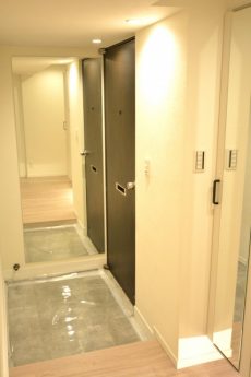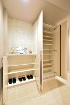 玄関を入って右側に鏡張りのシューズボックスあります。玄関の鏡、便利ですよね。