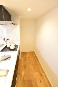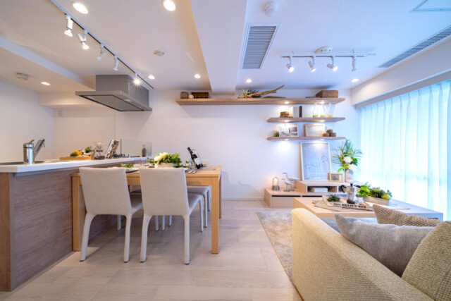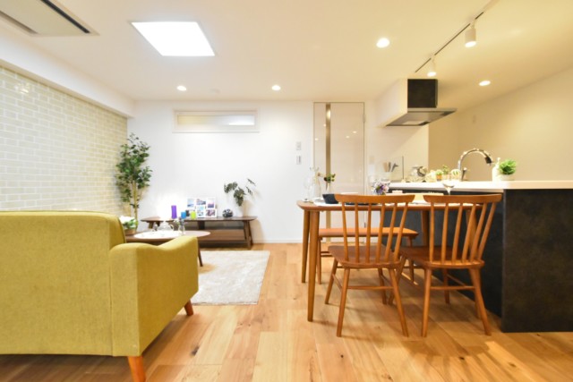 こちらは約14.9帖のリビング・ダイニング・キッチン。手前にキッチンのある奥に長いお部屋です。このタイプは手前にダイニング、奥にリビングと使い分けがし易くていいんですよね。