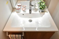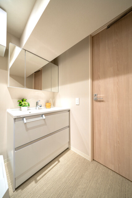 収納は三面鏡裏のキャビネットと洗面台下の棚。キャビネットは、細かい物が多くなりがちな洗面周りの必需品です。