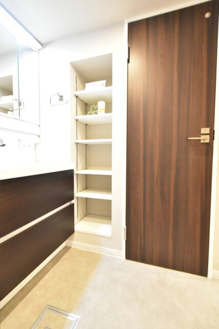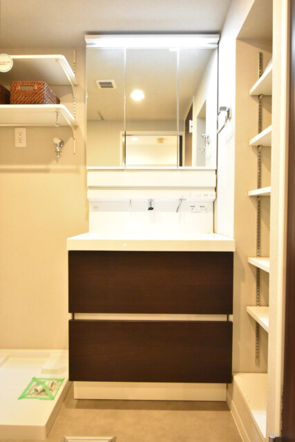 三面鏡の洗面化粧台。洗濯機置き場の上部には備え付けの棚が設置されています。ホームセンターで洗濯機置き場の上部スペースを利用するために置く棚を買う必要がありません。