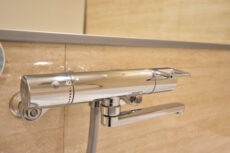 浴槽は追い焚き機能のないシンプルなタイプ。最近の浴槽は保温機能に優れているので結構長く温かさを保ってくれますよ。更に、水栓には200や300など目盛りがあって出すお湯の量をセットする事が出来るようですので、忘れてお湯が溢れるなんて心配はなさそうです(^^)v