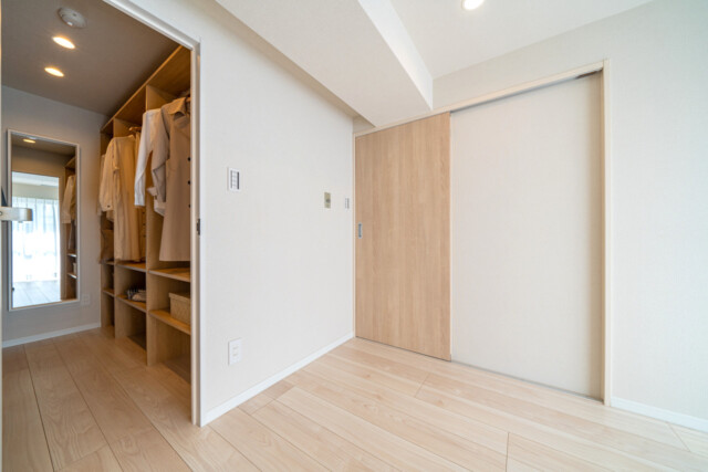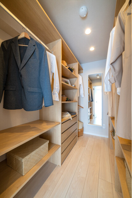 右と左に二つのウォークインクローゼット!収納品で分けたり、個人別に分けたりできそうですね。大きさはどちらも同じ約1帖です。喧嘩になりません。