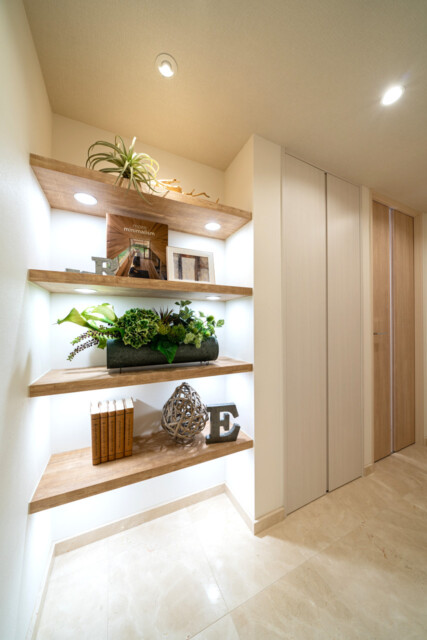 振り返って…玄関の左側はオープンのシューズインクローゼット。靴だけでなくベビーカーやキャリーケースなども置いておく事が出来そうです。