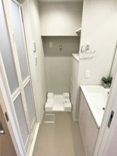 洗面室には洗面化粧台の他に洗濯機スペース、浴室がまとまっていて、脱衣所も兼ねています。洗面化粧台はスッキリとした印象の一枚鏡。収納が少なめなので、洗面周りの細々としたものはランドリー用品と一緒に奥のニッチカウンターに置くことになりそうです。