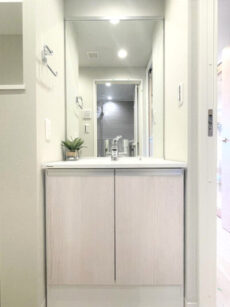 洗面化粧台は身だしなみのチェックに便利な三面鏡付き。上部に付けられた照明のおかげで影になったりすることもありません。三面鏡裏はキャビネットになっているので、洗面まわりに溢れる細々としたものもスッキリ収納可能です。