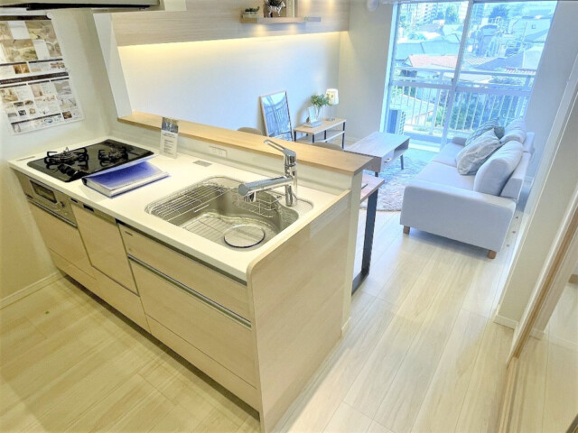 開放的でお料理中でもリビングダイニングとの一体感があるのが特徴です。腰壁のおかげで手元が隠れて目立たないので、人目を気にせずお料理に集中出来ますよ。食器洗浄乾燥機や浄水機能一体型など便利機能も充実♪